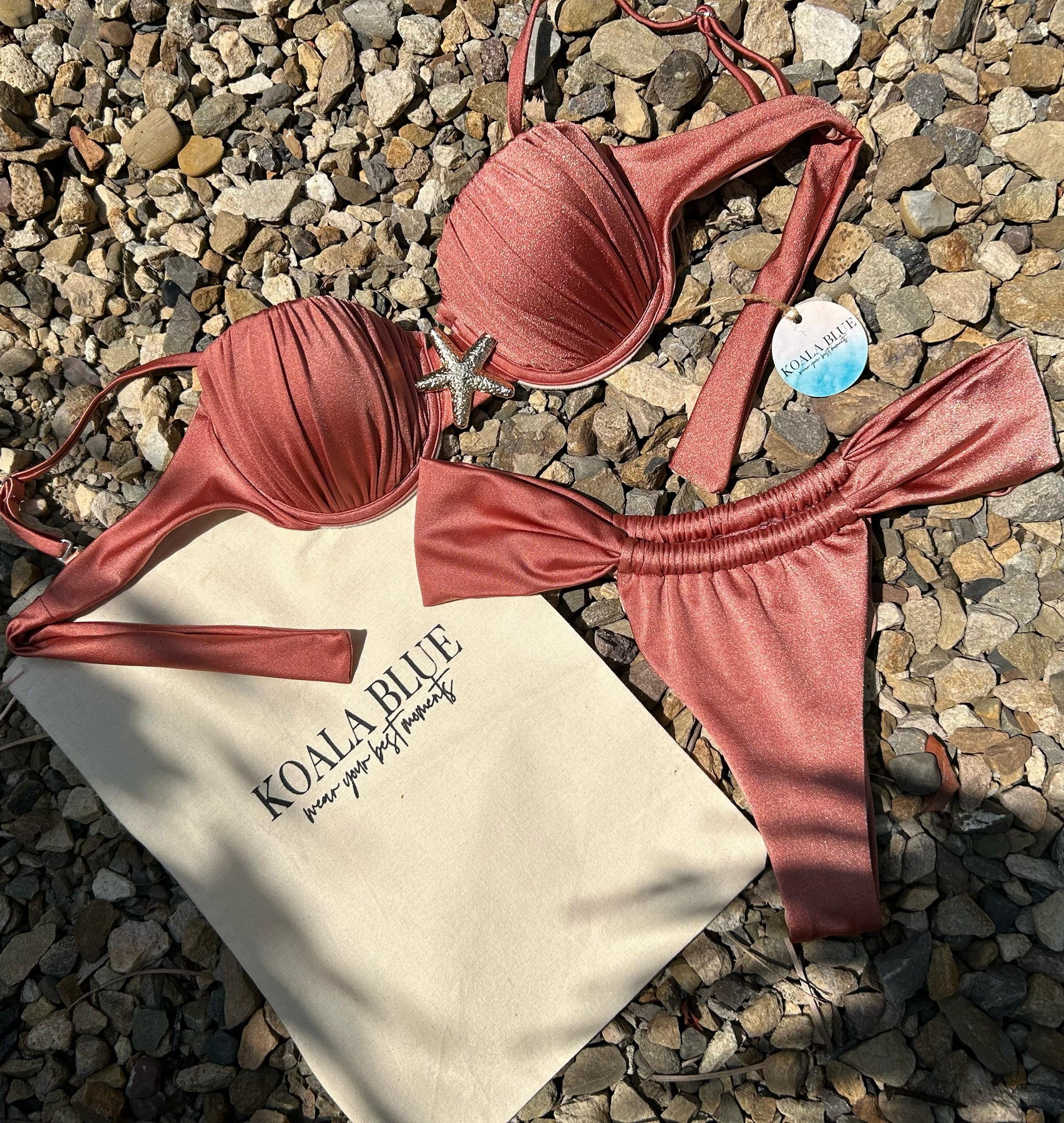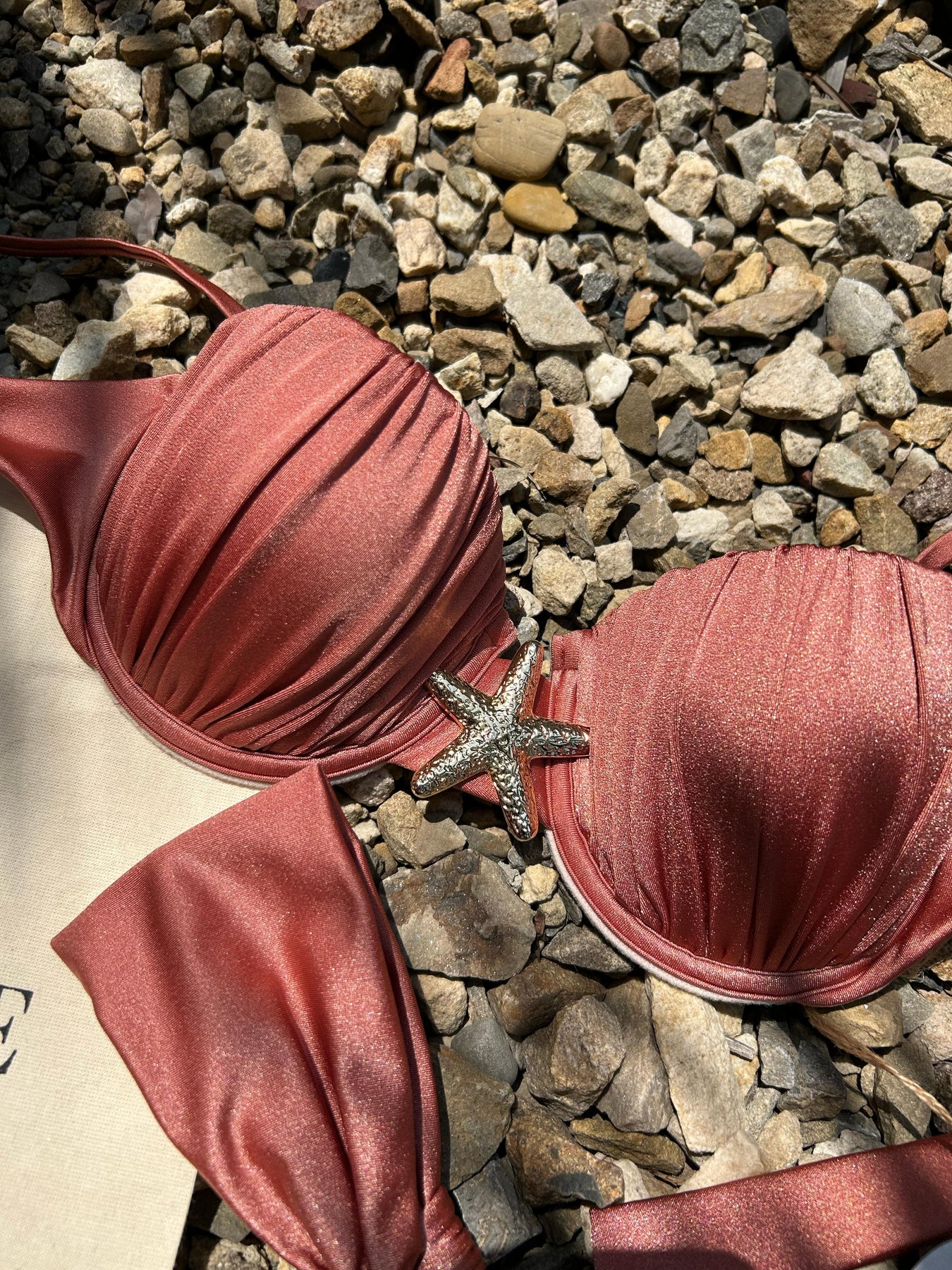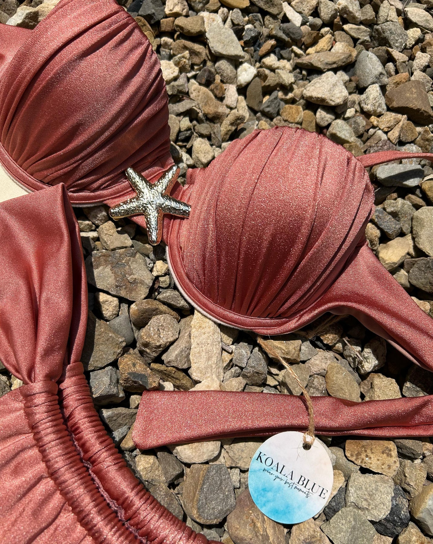 Descubre la elegancia sutil de nuestro nuevo bikini Clovelly. Su tono rose metálico y el detalle de estrella marina crean una combinación encantadora y sofisticada. Diseñado con copas push up y varilla underwire, realza tu figura mientras te brinda el soporte ideal.